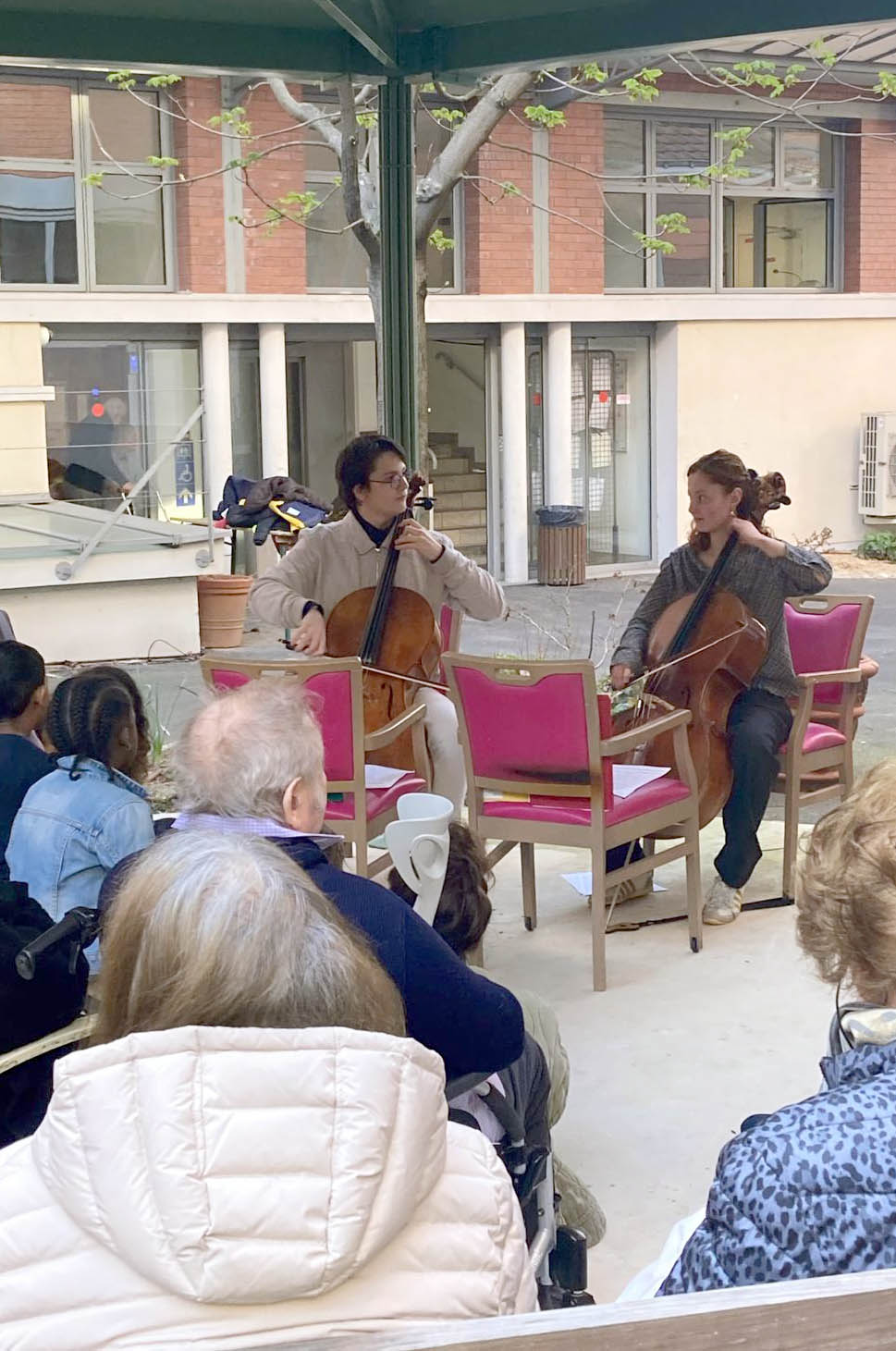 Concert bénévole de notre Duo de violoncelles avec Léonie, à destination des personnes âgées à l’EHPAD