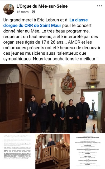 Concert de la classe d’orgue d’Éric Lebrun, présenté par Éric Lebrun, à l’église Notre-Dame de la Nativité du Mée-sur-Seine.